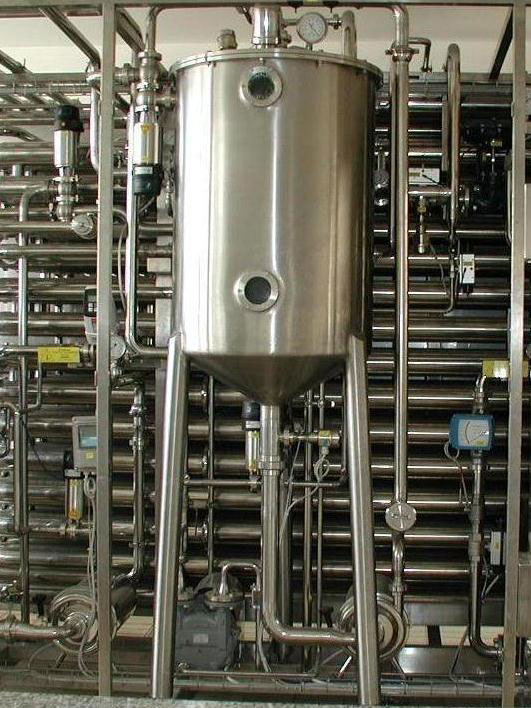 Vacuum pan system stem heated with slow speed scraper blades complete with vacuum pump, vapor condenser Product feed cum emptying pump and interconnecting pipe and fittings. All contact parts made of stainless steel (AISI 304). Capacity 400 Kg feed per hour. The product is fed into vacuum pan and is concentrated with water evaporation under vacuum in batch system and takes about 2 hours per batch.